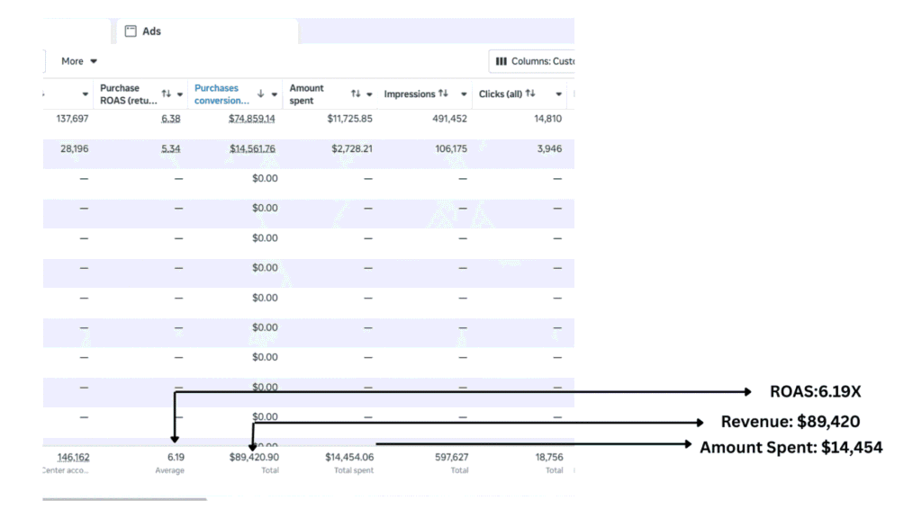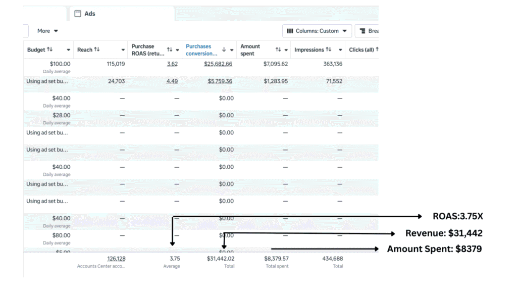 Through continuous testing, optimization, and scaling the best-performing creatives, the campaigns generated $31,442 in revenue with a 3.75X ROAS on $8,379 ad spend, creating a much stronger and more predictable growth channel for the brand.
